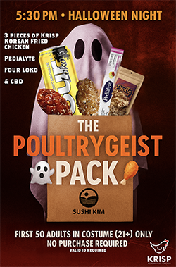 PITTSBURGH, PA, October 27, 2025 (PittsburghNewsWire.com) — This Halloween, Sushi Kim 2 in Pittsburgh’s Strip District is treating adults to a little mischief. The restaurant will debut The Poultrygeist Pack, the city’s first-ever adult trick-or-treat bag, packed with Korean fried chicken, drinks, and surprises for the 21+ crowd.
