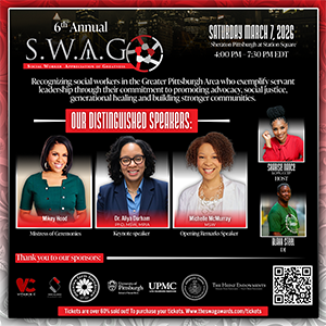 The 6th Annual SWAG Awards is supported by lead community partners, including Allegheny County Department of Human Services as Platinum Sponsor and the University of Pittsburgh School of Social Work as Gold Sponsor, reflecting a shared commitment to strengthening the social work workforce and advancing community wellbeing.